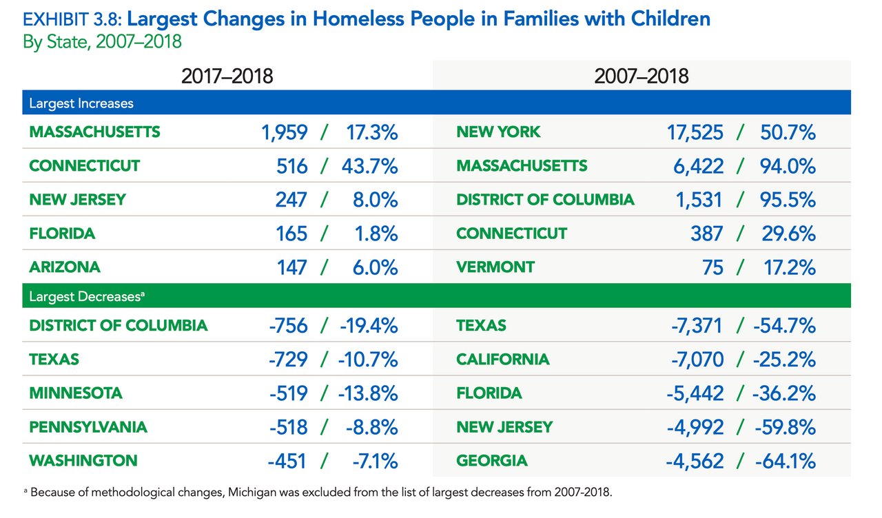 L’augmentation du sans-abrisme chez les personnes vivant dans des familles avec enfants a augmenté dans 12 États entre 2017 et 2018. Les augmentations les plus importantes ont été enregistrées au Connecticut, où elle était de 44 pour cent (516 personnes de plus dans les familles sans abri avec enfants) et au Massachusetts, où elle était de 17 pour cent (1.959 personnes de plus).