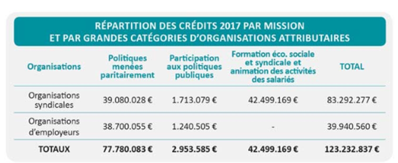 Dans son rapport pour l’année 2017, l’AGFPN, organisme paritaire créé en 2015 pour assurer une traçabilité des sources de financement des organisations patronales et syndicales, souligne qu’en 2017, les organisations syndicales ont reçu 83 292 277 euros de crédits des contributions employeurs et de l’Etat que l’AGFPN divise en 3 missions :
