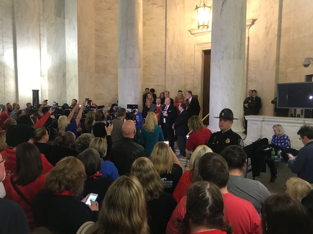 Mardi soir, après avoir déclaré la poursuite de la grève, le président de l’AFT-WV, Fred Albert, et le président du WV-SSPA, Joe White, ont lancé un appel direct aux politiciens de l’État pour qu’ils les couvrent encore afin de pouvoir ordonner aux enseignants de retourner au travail et maintenir un minimum de crédibilité. «Nous restons en grève un jour de plus pour nous assurer que ce projet de loi sera mort demain», a dit Albert. Pour sa part, White a admis que les enseignants s’opposaient à un retour au travail. «La confiance n’est pas là», dit-il.