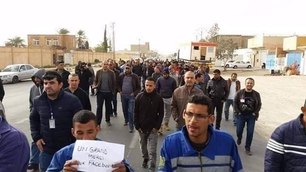Hier, les travailleurs d’ENGAGEO, une autre filiale de Sonatrach dans la même région les ont rejoint. Une photo de travailleurs d’ENGAGEO en train de quitter le travail montre une pancarte de gréviste qui dit: «Un grand merci à Facebook!» Des centaines de travailleurs du complexe gazier Oued Ezzine à Adrar, au centre de l’Algérie, ont entamé la grève lundi. Les travailleurs de Sonelgaz à Guelma ont effectué une occupation des locaux.