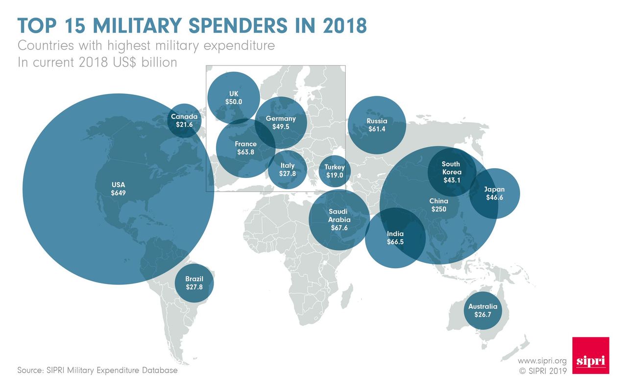 Selon un rapport annuel publié cette semaine par l’Institut international de recherche sur la paix de Stockholm (SIPRI), les dépenses militaires mondiales ont atteint un nouveau sommet depuis la fin de la guerre froide. En 2018, ils avaient dépassé 1800 milliards de dollars (1600 milliards d’euros). Il s’agit d’une augmentation de 2,6 pour cent par rapport au précédent record annuel des dépenses militaires mondiales en 2017.