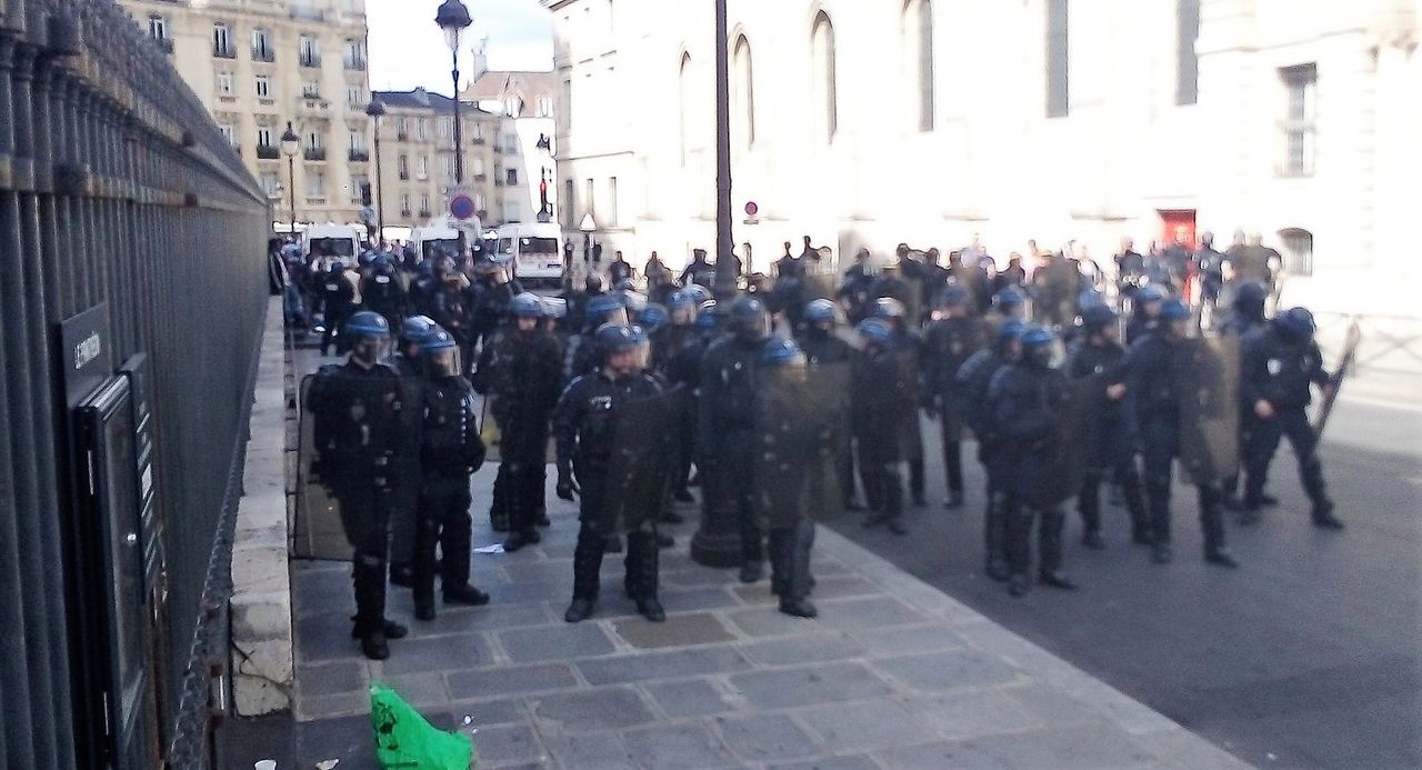 A 16h, les forces de l’ordre ont pénétré dans le Panthéon pour expulser les “Gilets Noirs”, qui scandaient, “Qu’est-ce qu’on veut? Des papiers! Pour qui? Pour tous!” et insistaient qu’ils ne se déplaceraient qu’ensemble. Peu avant 17h, les forces de l’ordre ont fait évacuer le Panthéon dans le calme, puis nassé les “Gilets Noirs” derrière le bâtiment.