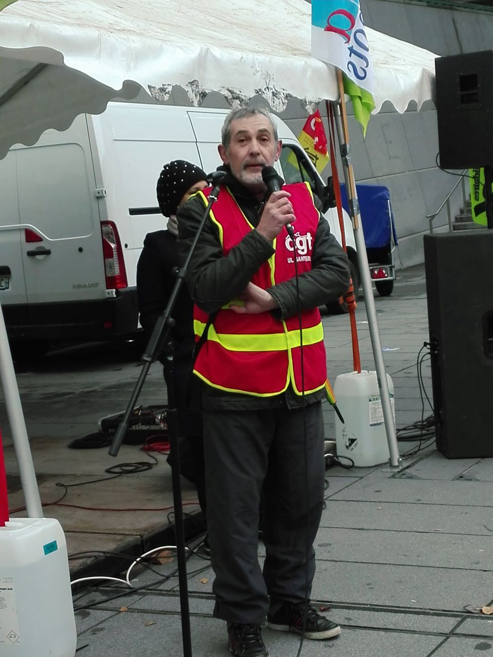 Un cégétiste a pris la parole pour promouvoir les droits négociés à la fin de la 2e Guerre mondiale par le Conseil national de la Résistance (CNR) qui regroupait gaullistes, social-démocrates et staliniens. La CGT et le PCF stalinien ont dissous les comités d’usine, intégré les maquis résistants dans l’armée régulière et étranglé une révolution contre le régime fasciste de Vichy. En échange, ils ont obtenu l’approbation des gaullistes et des social-démocrates pour créer un système de retraites, de santé et d’allocations familiales: la Sécurité sociale.