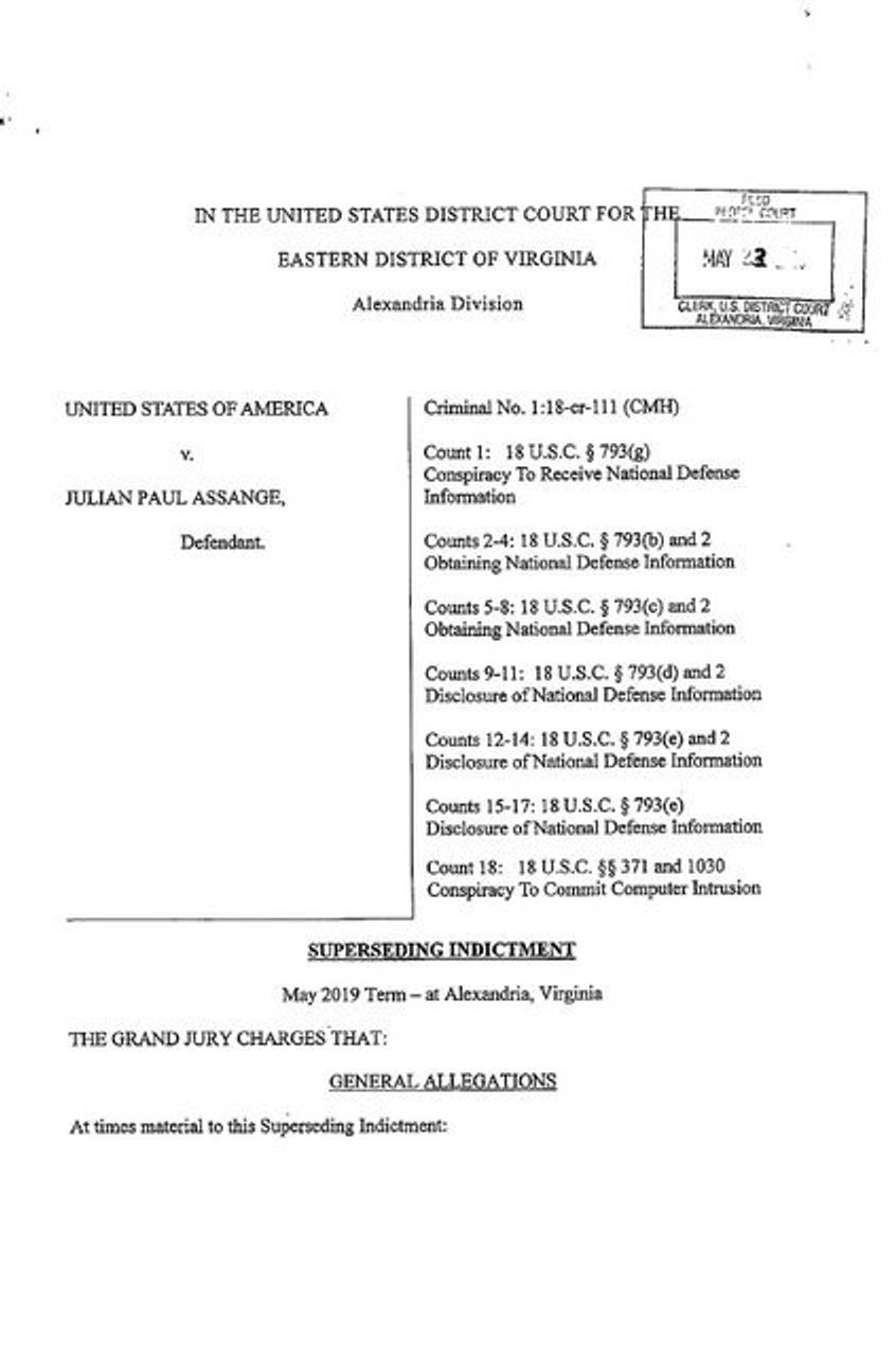 L’acte d’accusation modifié qui compte 37 pages et fut déposé le 23 mai 2019, énonçait dix-sept chefs d’accusation contre Assange en vertu de la Loi sur l’espionnage de 1917 (Titre 18, section 793 du Code des États-Unis et sections connexes) ; il retenait comme 18e chef d’accusation l’allégation de piratage informatique.
