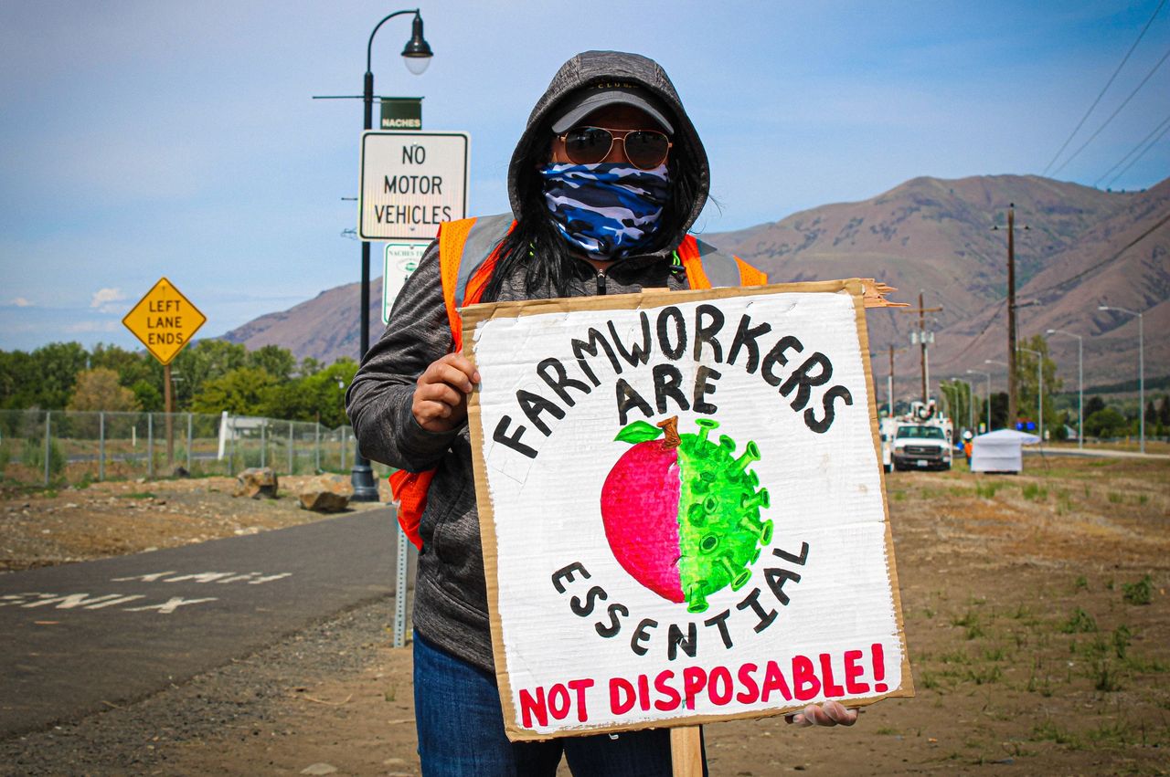 «Les travailleurs agricoles sont essentiels, pas jetables», «Nous sommes humains», «Plus d'esclavage» et «Nous avons besoin de protections», pouvait-on lire sur des pancartes en espagnol et en anglais portées par des travailleurs qui ont fait grève dans quatre usines d'emballage de fruits de la vallée de Yakima, dans l'État de Washington, à environ 240 km au sud-est de Seattle.