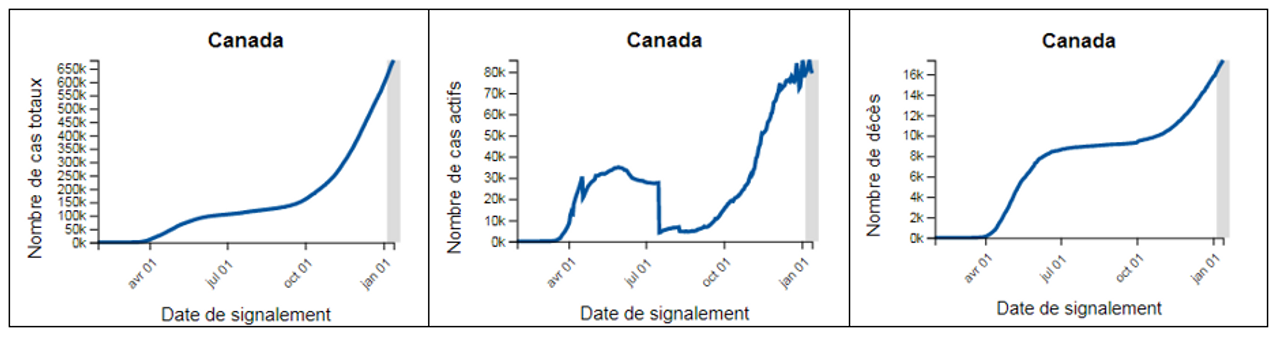 Selon les données fournies par le gouvernement canadien, on dénombrait suite à la première vague plus de 8.800 décès au pays (dont plus de 5.600 dans la seule province de Québec) et près de 109.000 cas d’infections. En date du 19 janvier, c’est plus de 18.200 personnes qui ont perdu la vie au Canada, alors que le nombre d’infections dépasse les 719.000.