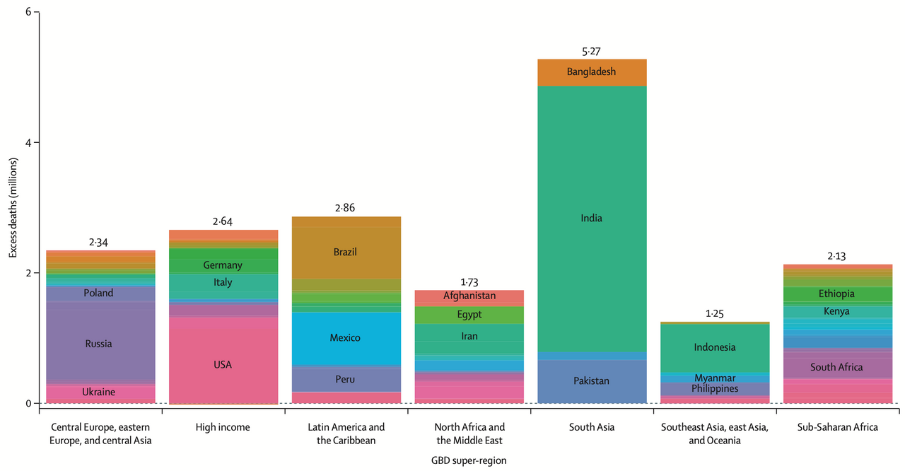 million de décès. Le Mexique (798.000), le Brésil (792.000), l’Indonésie (736.000) et le Pakistan (664.000) sont également des pays qui ont subi des pertes de vies très importantes. En outre, six autres pays, le Bangladesh, le Pérou, l’Afrique du Sud, l’Iran, l’Égypte et l’Italie, ont tous enregistré plus d’un quart de millions de décès excédentaires.