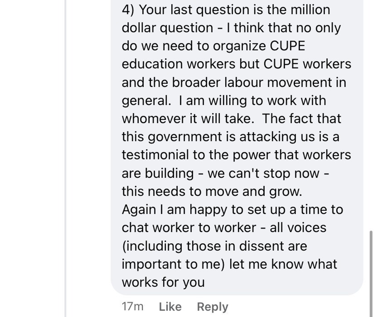 Walton a qualifié la requête du travailleur de «question à un million de dollars», mais a refusé de fournir une réponse directe. Le mieux qu’elle a pu offrir était un vague engagement envers le «besoin d’organiser les travailleurs de l’éducation du SCFP... et le mouvement syndical en général».