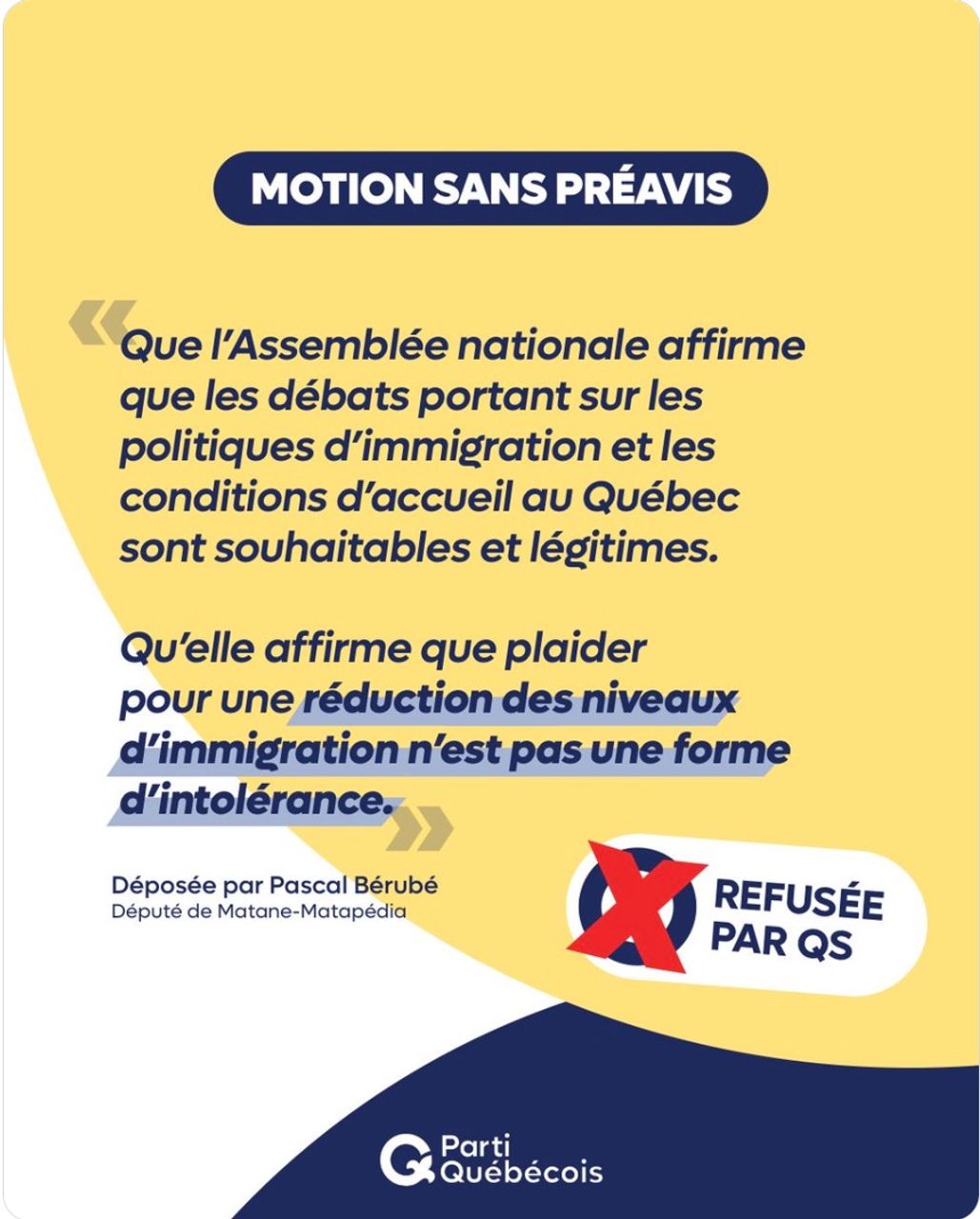 Par exemple, le 29 mai dernier, le député péquiste Pascal Bérubé a présenté une motion demandant à l’Assemblée nationale d’affirmer que «les débats portant sur les politiques d'immigration et les conditions d'accueil au Québec sont souhaitables et légitimes» et que «plaider pour une réduction des niveaux d'immigration n'est pas une forme d'intolérance». En chambre, QS a bloqué l’adoption de la motion au motif que deux amendements proposés par le parti avaient été refusés par le PQ.