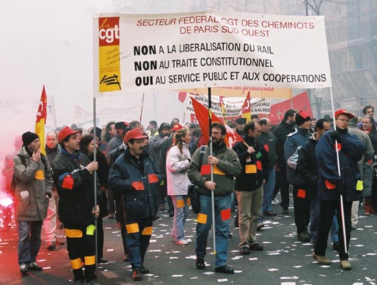 Après les grandes protestations du 10 mars en France:gouvernement et PS resserrent les rangs autour du oui au référendumPar Richard Dufour Utilisez cette version pour imprimer La colère populaire suscitée par la politique de démolition sociale du gouvernement ultra-conservateur de Jacques Chirac s'est massivement déversée dans les rues de France la semaine dernière - pour la troisième fois depuis le début de l'année, après les grosses journées de protestations du 20 janvier et du 5 février. Après des dizaines de milliers de lycéens, qui ont battu le pavé en début de semaine dans plus de 150 villes pour protester contre la loi Fillon, ils ont été près de un million jeudi le 10 mars, y compris 150.000 à Paris, à manifester dans tout le pays contre l'assaut gouvernemental et patronal sur les conditions de travail, les salaires, les emplois et le niveau de vie. Les cortèges associaient enseignants et lycéens, fonctionnaires, chercheurs, salariés d'Électricité et Gaz de France (EDF-GDF), à de nombreuses délégations du secteur privé marchant sous les banderoles de Lidl ou Alcatel à Marseille, EADS, Latécoère ou Carrefour à Toulouse, Legrand à Limoges, RVI à Lyon, pour ne nommer que celles-là.