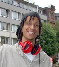 Markus devant la gare centrale de Duisbourg. Sur sa pancarte on peut lire :