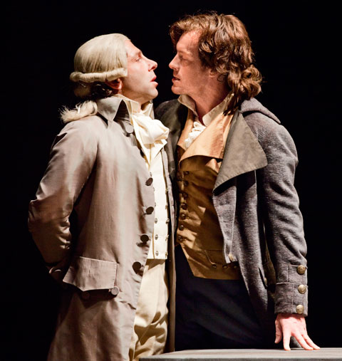 Elliot Levey (à gauche) dans le rôle de Robespierre et Toby Stephens ( à droite) dans le rôle de Georges Danton. (Photo: Johan Persson)