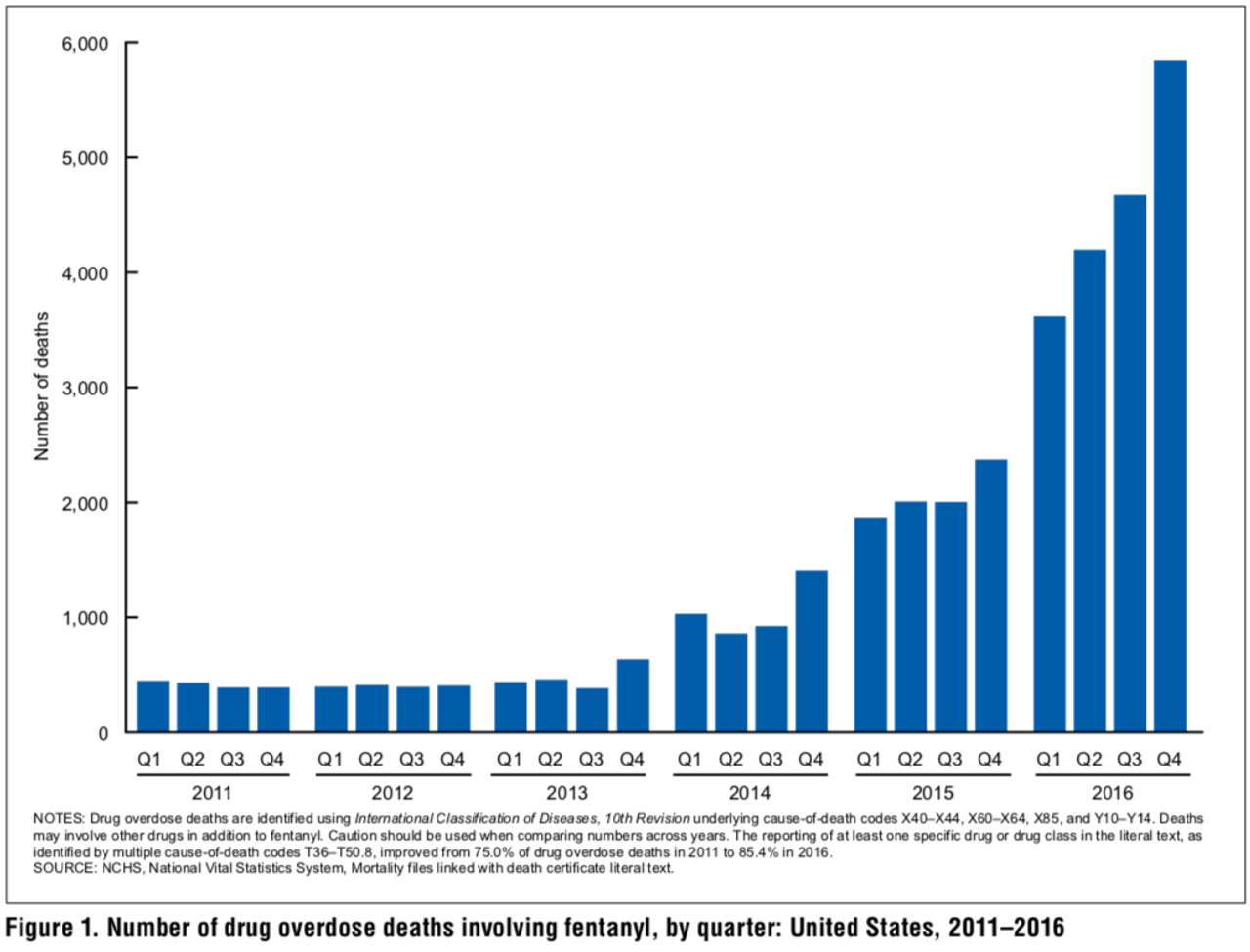En studie utgitt på torsdag av CDCs Nasjonalsenter for helsestatistikk (NCHS) bød mer dystre detaljer om overdosedødsfall av fentanyl. I årene 2011 og 2012 var fentanyl medvirkende i omtrent 1 600 overdosedødsfall i USA, begge år. Fra 2012 til 2014 ble fentanyl-relaterte dødsfall mer enn fordoblet hvert år. Innen 2016 hadde dødsfallene som tilskrives fentanyl skutt til himmels, til mer enn 18 335, en ti-dobling avtallene for 2011 og 2012.