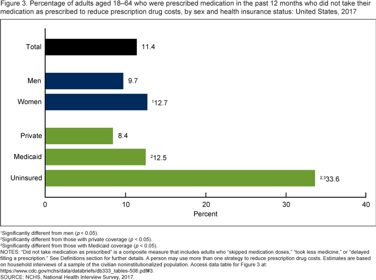 Et NCHC Data Brief publisert i senterets mars-2019-utgave undersøkte strategiene anvendt av voksne i alderen fra 18 til 64 for å redusere kostnadene for reseptbelagte medisiner. I 2017 var sannsynligheten større for at de som ikke var helseforsikret gikk til tiltak for å redusere kostnadene, enn de enten med privatforsikring eller Medicaid.