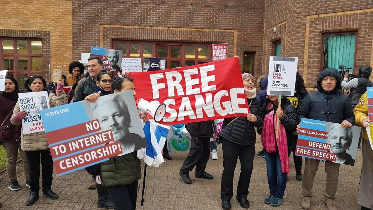 «I dag står vi utenfor Belmarsh fengsel, der en vestlig utgiver har blitt arrestert. Vilkårlig innesperret alle disse årene, og nå dette.»