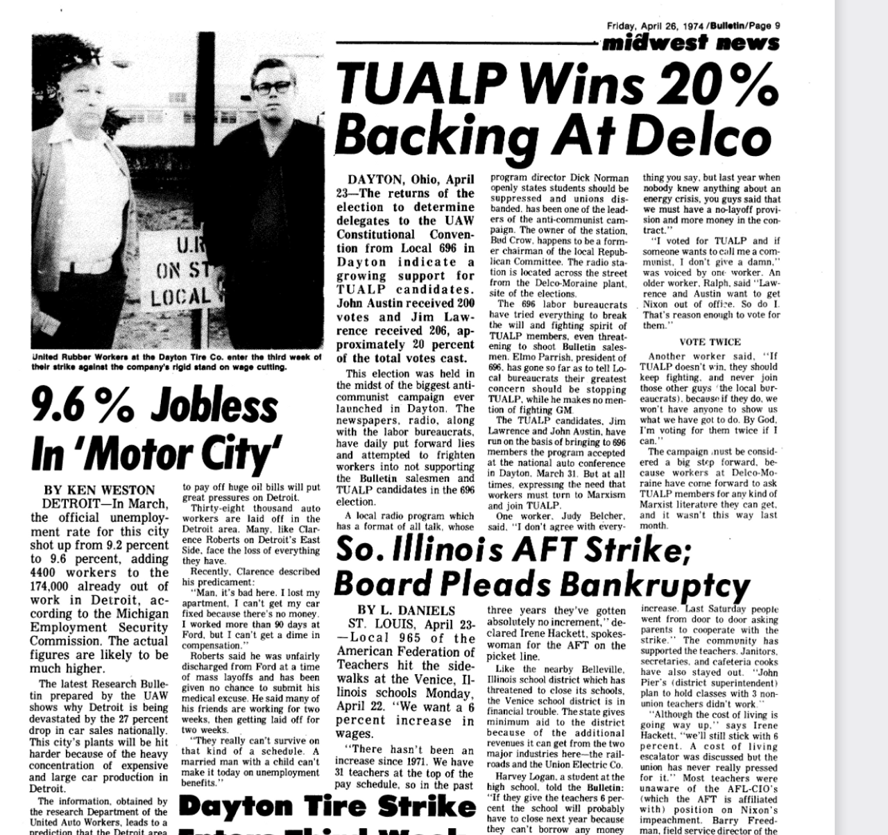 I april 1974-valget for den lokale fagforeningen på Delco Moraine-fabrikken, fikk TUALP-kandidatene Jim Lawrence og John Austin 20 prosent av stemmene for lokalavdelingens president og visepresident. TUALP-supportere stilte også til valg som ledere på fabrikkgulvet, og for fem andre styreverv.