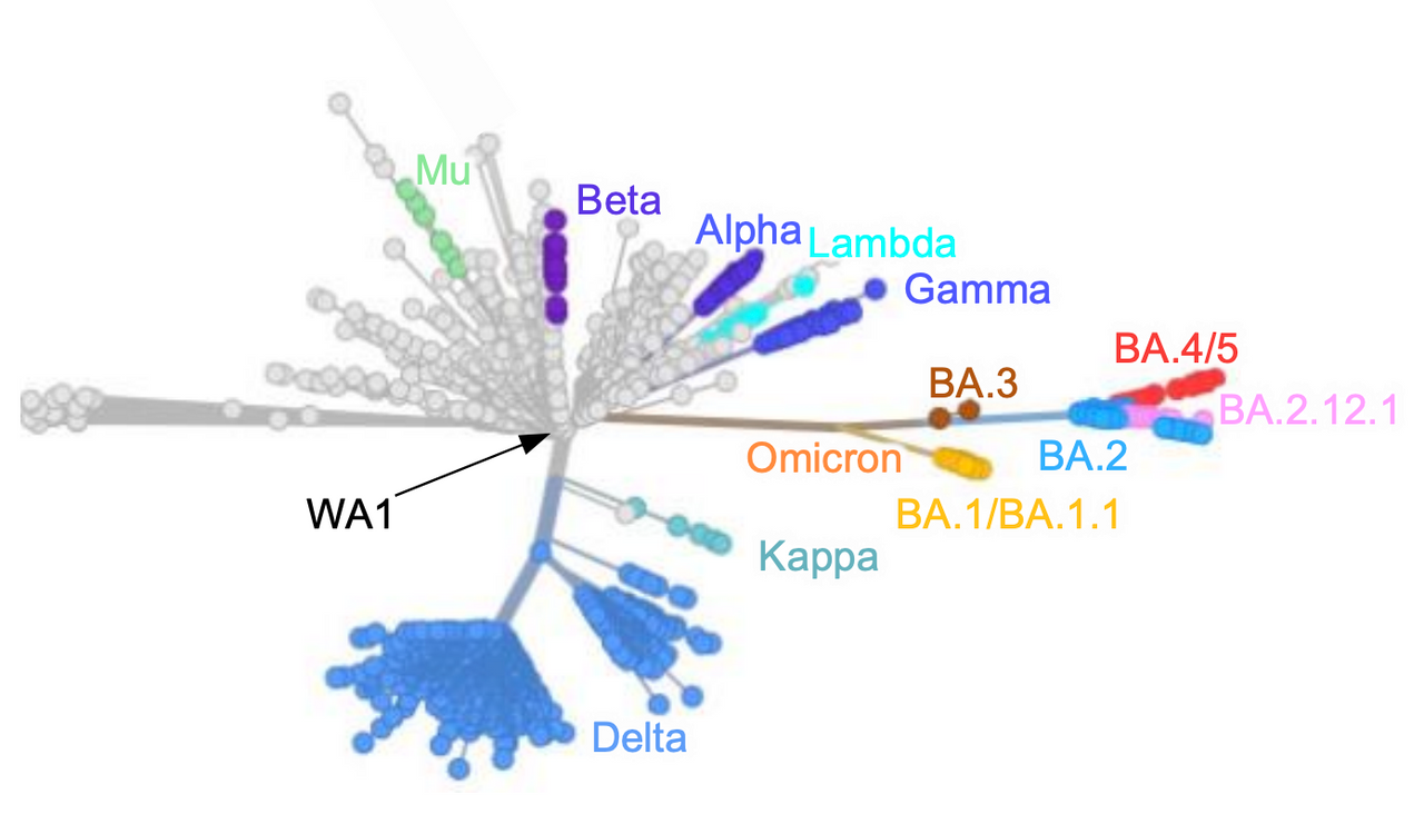 Ele explicou: “Esta imagem mostra a árvore genealógica das diferentes variantes do coronavírus. Em cinza, eu tenho a variante original da pandemia, e essa mesma variante foi utilizada para que a gente conseguisse produzir as vacinas. A questão é que as novas variantes estão se distanciando geneticamente da variante que deu origem à pandemia e que foi utilizada para que a gente realizasse e produzisse as vacinas.
