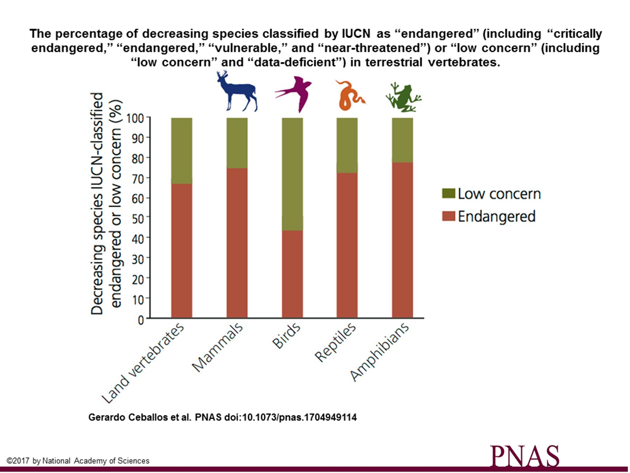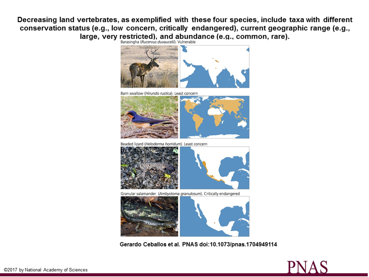Авторы утверждают, что в то время как темпы вымирания сами по себе вызывают тревогу, — в течение прошедшего столетия наблюдается исчезновение, по меньшей мере, двух видов позвоночных в год, — это еще не дает полной картины происходящего. Даже если виды еще не вымерли, их численность и географическое распределение резко сокращаются, сигнализируя об ускоряющейся тенденции к возможному исчезновению.