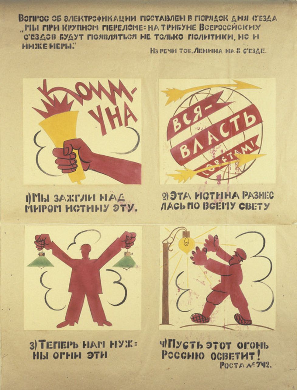 В феврале 1920 года, когда Ленин впервые выступил с планом электрификации, он заметил, что «организация промышленности на современной высшей технической базе, на базе электрификации, которая свяжет город и деревню, покончит с рознью между городом и деревней, даст возможность культурно поднять деревню, победить даже в самых глухих углах отсталость, темноту, нищету, болезни и одичание» [Ленин, ПСС, т. 40, стр. 109].