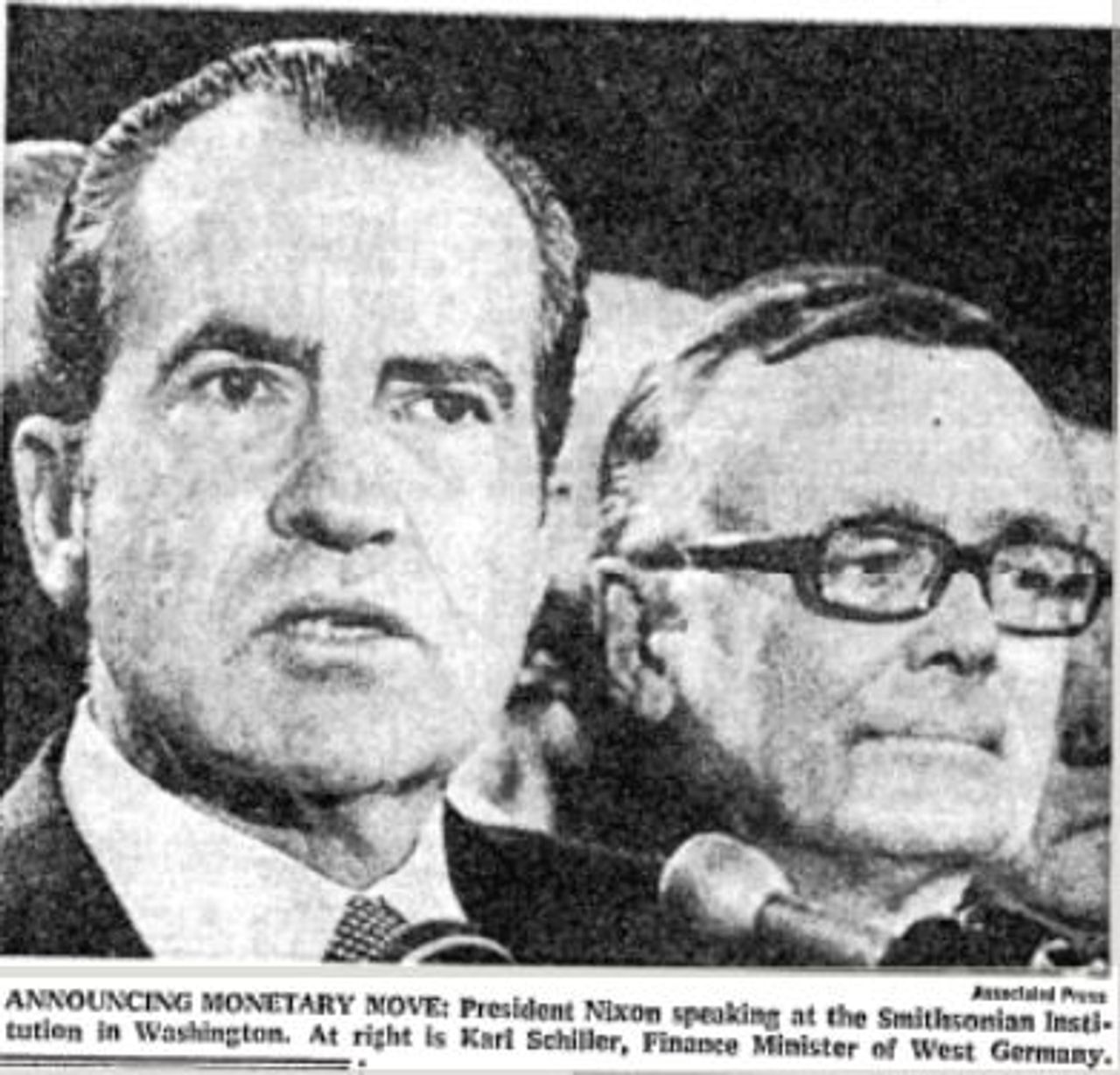 18 декабря 1971 года доллар США обесценился на 8,57% по отношению к другим валютам. Девальвация была частью экономических мер, названных «шоком Никсона», которые последовали вместе с прекращением действия Бреттон-Вудской системы фиксированных валютных паритетов, основанной на конвертируемости доллара в золото. Девальвация, наряду с другими мерами, такими как замораживание заработной платы, была направлена на то, чтобы переложить издержки глобального экономического спада на рабочий класс и защитить корпоративные прибыли.
