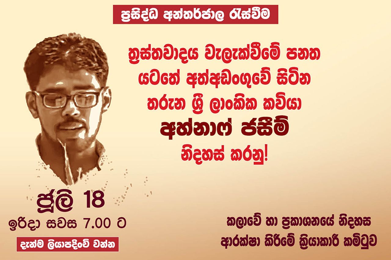 අහ්නාෆ් ජසීම් නිදහස් කරගැනීමේ උද්ඝෝෂනයෙහි කොටසක් ලෙස කලාවේ හා ප්රකාශනයේ නිදහස ආරක්ෂා කිරීමේ ක්රියාකාරී කමිටුව (කප්රනිආක) ජූලි 18 වැනි ඉරිදා පස්වරු 7ට ප්රසිද්ධ ඔන්ලයින් රැස්වීමක් පවත්වනු ඇත. 26 හැවිරිදි කවියා ශ්රී ලංකාවේ රුදුරු ත්රස්තවාදය වැලැක්වීමේ පනත යටතේ අත්තනෝමතික ලෙස වසරකට වැඩි කාලයක් මුලුල්ලේ රඳවනු ලැබ සිටී.