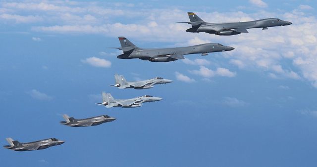 ඇමරිකාවේ බී1-බී ලාන්සර් මූලෝපායික බෝම්බ හෙල යානා සමග සැඟවී යා හැකි ප‍්‍රහාරක යානා (F-35B Lightening stealth fighters) ජපාන මුහුදට ඉහලින් ගුවන්ගතකර තිබියදී,