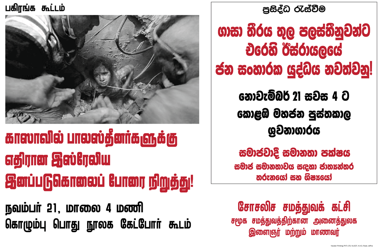 ஐரோப்பிய மற்றும் வட அமெரிக்க ஏகாதிபத்திய சக்திகளின் ஆதரவுடன் இஸ்ரேல் பாலஸ்தீனியர்களை இனப்படுகொலை செய்து வருகிறது. இது, ஐரோப்பிய யூதர்கள் மீது நாஜிக்கள் மேற்கொண்ட இறுதித் தீர்வான இனப்படுகொலைக்கு ஒப்பான மனிதகுலத்திற்கு எதிரான குற்றமாகும்.
