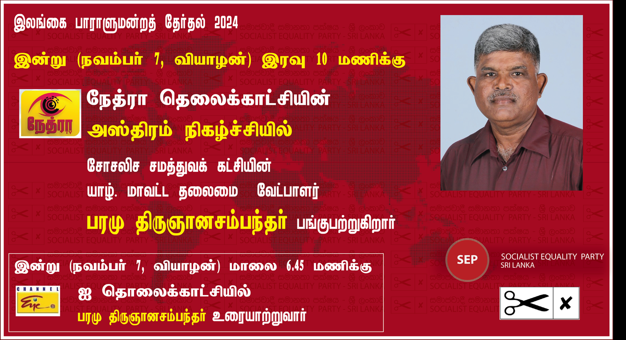 கட்சியின் யாழ்ப்பாண மாவட்ட தலைமை வேட்பாளர் பரமு திருஞானசம்பந்தர் இன்று இலங்கை ஐ தொலைக் காட்சியில் 6.46 மணிக்கு கொள்கை விளக்க உரையை நிகழ்த்தும் அதேவேளை இரவு 10 மணிக்கு நேத்ரா தொலைக் காட்சியில் அஸ்திரம் நிகழ்ச்சியிலும் பங்குபற்றுகிறார். இந்த நிகழ்ச்சிகளில் சமகால சர்வதேச மற்றும் இலங்கை அரசியல் நிலைமைகளை பற்றி ட்ரொட்ஸ்கிச, சர்வதேச சோசலிச நிலைப்பாட்டில் இருந்து அவர் கலந்துரையாடுவார். தொழிலாள வர்க்கம் எதிர்கொள்ளும் பிரச்சினைகளை தீர்ப்பதற்கான சோசலிச சமத்துவக் கட்சியின் முன்நோக்கு பற்றியும் திருஞானசம்பந்தர் விளக்குவார். இந்த நிகழ்ச்சிகளை பார்க்குமாறு தொழிலாளர்கள், புத்திஜீவிகள் மற்றும் இளைஞர்களுக்கும் நாம் அழைப்பு விடுப்பதோடு, சோசலிச சமத்துவக் கட்சியை தொடர்புகொள்ளுமாறும் கேட்டுக்கொள்கிறோம்.