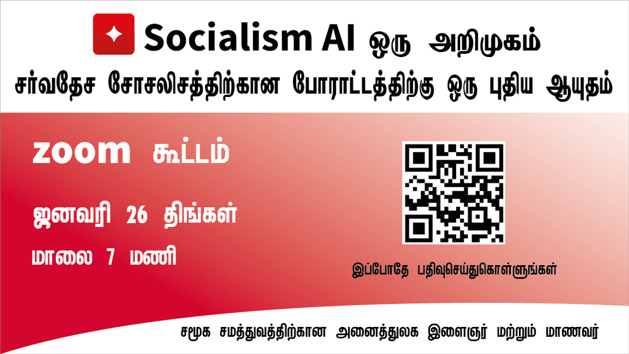 சர்வதேச சோசலிச முன்னோக்கின் அடிப்படையில், உலக அளவில் தொழிலாள வர்க்கத்தின் ஒரு சுயாதீனமான அரசியல் இயக்கத்தைக் கட்டியெழுப்புவதன் மூலம் மட்டுமே, உலகம் முழுவதும் பேரழிவு தரும் போர்கள் மற்றும் சமூக துயரங்களுக்கு மூலகாரணமான உலகளாவிய முதலாளித்துவ அமைப்புக்கு எதிரான போராட்டத்தை முன்னெடுக்க முடியும். இதை வெற்றிகரமாக நடத்த, இந்த சக்திவாய்ந்த புதிய ஆயுதமான சோசலிசம் AI ஆற்றக்கூடிய வரலாற்றுப் பங்கைப் பற்றி கலந்துரையாடும் இந்த முக்கியமான நிகழ்நிலை கூட்டத்தில் பங்கேற்குமாறு அனைத்து தொழிலாளர்கள், இளைஞர்கள் மற்றும் மாணவர்களுக்கும் ஐ.வை.எஸ்.எஸ்.இ. அழைப்பு விடுக்கின்றது.