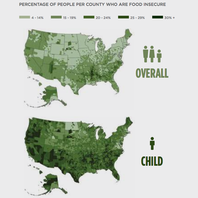 மாநிலம் (state) மற்றும் மாவட்டம் (County) என்று பிரித்துப் பார்த்தால் உலகின் பல பகுதிகளில் இருக்கும் நிலைமையைவிட இங்கு நிலைமை மிகவும் மோசமாக உள்ளது. உதாரணமாக மிசிசிபியில் மக்கட் தொகையில் 22.3%, நான்கில் ஒருவர் உணவுப் பாதுகாப்பு இன்றி உள்ளனர். இப்படித்தான நியூ மெக்சிகோவில் 29% குழந்தைகள் உள்ளன, கிட்டத்தட்ட அனைத்துக் குழந்தைகளிலும் மூன்றில் ஒரு பகுதியினர். நாட்டில் அதிக மக்கட்தொகை கொண்ட மாநிலமான கலிபோர்னியா உட்பட, 16 மாநிலங்களில் நான்கில் ஒரு குழந்தைக்கும் மேலாக, உணவுப் பாதுகாப்பு இன்றி உள்ளன. உணவுப் பாதுகாப்பற்ற நிலை என்பதின் பொருள் ஒரு வீட்டில் “ஆரோக்கியமான வாழ்க்கை முறையை பராமரிக்க போதுமான அளவு உணவு இராது” என்பதாகும் என்று ஃப்ரேசர் WSWS இடம் விளக்கினார். “சில சமயம் அவர்கள் உணவு உட்கொள்வதில்லை, அல்லது தங்கள் வயிற்றை தேவையான ஊட்டச்சத்து இல்லாத உணவுகளால் நிரப்புகின்றனர், ஒரு சமச்சீர் உணவிற்கு பதிலாக ஒரு கிண்ணம் அரிசி என.” “மந்த நிலை தாக்கியவுடன், உணவுப் பாதுகாப்பற்ற மக்களின் எண்ணிக்கை 38 மில்லியன் மக்களில் இருந்து கிட்டத்தட்ட 50 மில்லியன் என பெரிதும் உயர்ந்து விட்டது. ஃப்ரேசர் மேலும் கூறினார்: “மந்தநிலை முடிந்துவிட்டது என்ற அறிவிப்பு வந்தபோதிலுமகூட, இப்புள்ளிவிவரங்கள் காட்டுவது மக்கள் தமது தேவைகளை பூர்த்தி செய்ய கடினமான நேரத்தைக் கொண்டுள்ளனர், தங்களுக்கும் தங்கள் குடும்பத்தினருக்கும் போதுமான உணவைப் பெறுவதில் இடரைக் காண்கின்றனர்.” லாஸ் ஏஞ்சல்ஸ் மாவட்டம், நியூ யோர்க பெருநகரப்பகுதி, கூக் மாவட்டம் (இதில் சிக்காகோ அடங்கியுள்ளது) ஆகியவை அமெரிக்காவிலேயே உயர்ந்த எண்ணிக்கையில் உணவுப் பாதுகாப்பற்ற மக்களை கொண்டுள்ளன. லாஸ் ஏஞ்சல்ஸில் 1.6 மில்லியன் மக்கள் உணவுப் பாதுகாப்பற்ற நிலையில் உள்ளனர், நியூ யோர்க்கின் 5 பிரிவுகளில் 1.4 மல்லியன் மக்கள், கூக் மாவட்டத்தில் 0.8 மில்லியன் உள்ளனர். டெட்ராயிட் உள்ளடக்கிய, வேன் மாவட்டத்தில் வசிப்பவர்களில் 21 வீதத்தினர், (ஐந்தில் ஒருவருக்கும் மேலானோர்) 2012ல் உணவுப் பற்றாக்குறையில் இருந்தனர். டெக்சாஸில் உள்ள டல்லாஸ் மக்களில் 20 வீதத்தினர் உணவுப் பாதுகாப்பற்று இருந்துள்ளனர். அமெரிக்க தலைநகரின் தாயகமான கொலம்பியா மாவட்டத்தில், 28% குழந்தைகள் உணவு பாதுகாப்பற்ற வீடுகளில் வாழ்கின்றனர். கிராமப்புற வறுமையும் பட்டினியும் பரவலாக உள்ளன. அமெரிக்காவிலேயே உணவு பாதுகாப்பின்மையின் அதிக அளவு கிராமப்புற மிசிசிபியில் மிக உயர்ந்து ஐந்தில் நான்கு மாவட்டங்களில் இருந்தது. ஹோம்ஸ் மாவட்டம், தெற்கு மாநிலத்தில் உணவுப் பாதுகாப்பற்ற தன்மை 32% எனவும் Yazoo மாவட்டத்தில் இது 27% எனவும் கூறப்படுகிறது. டெக்சாஸ் Zavala 