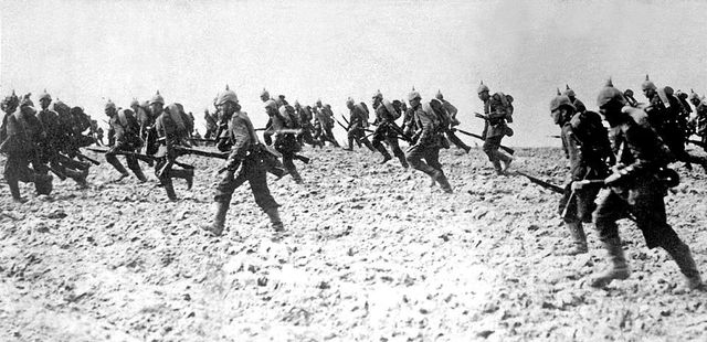 முதலாம் உலகப் போரின் தொடக்கத்தில், ஜேர்மனியில் இருந்து பாரிஸ் வரையான இராணுவமயப்படுத்தப்பட்ட எல்லை ஊடாக பிரெஞ்சுப் படைகள் நிலை கொண்டிருந்ததற்கு எதிரான, ஒரு தொடர்ச்சியான நடவடிக்கையின் பாகமாக, 1914 ஆகஸ்ட் 4 அன்று ஜேர்மனிய இராணுவப் படைகள் பெஸ்ஜியத்துக்குள் எல்லையைக் கடந்தன. ஷிலிபெஃன் திட்டத்தில் 1905 ஆரம்பத்திலேயே கட்டமைக்கப்பட்டவாறு ஜேர்மன் சூழ்ச்சியானது பெல்ஜியத்துக்குள் பிரமாண்டமானளவு ஜேர்மன் படைகள் நுழைவதற்கும், ஆங்கிலக் கால்வாய் ஊடாக முன்னகர்வதற்கும், மற்றும் பின்னர் இடது பக்கம் திரும்பி பிரெஞ்சு தலைநகர் வரை வடக்கு பிரான்ஸ் பூராவும் சிதைப்பதற்கும் அழைப்பு விடுத்தது. பிராங்கோ-ஜேர்மன் எல்லை ஊடாக ஆயுதமயப்படுத்தப்பட்டிருந்த பிரெஞ்சு நிலைகள் மீது நேரடியான தாக்குதல்களை தவிர்த்த நிலையில், இந்த திட்டம் பல தந்திரோபயாய முன்னேற்றங்களைக் கொண்டிருந்தபோதிலும், உலக யுத்தத்துக்குள் பிரிட்டிஷ் தலையீட்டை கிட்டத்தட்ட தவிர்க்க முடியாததாக்கியமை அதன் மூலோபாய ஆபத்தாக இருந்தது. இதற்கான காரணம், (பெல்ஜியம், நெதர்லாந்து, லுக்ஸம்பேர்க் போன்ற) கீழ் நிலை நாடுகளில் வெளிச் சக்திகள், குறிப்பாக பிரான்சோ அல்லது ஜேர்மனியோ செல்வாக்குச் செலுத்துவதை பிரிட்டிஷ் ஏகாதிபத்தியம் பொறுத்துக்கொண்டிருந்ததில்லை. பெல்ஜியத்தின் மீது ஜேர்மன் போரைத் தொடங்கிய அதே தினம், பிரிட்டன் ஜேர்மனி மீது போர்ப் பிரகடனம் செய்தது. ஜேர்மன், அதிசிறந்த ரயில் போக்குவரத்து முறையையும் அமைப்பையும் கொண்ட, குறிப்பிடத்தக்க எதிர்த்தாக்குதல் நடவடிக்கையை முன்னெடுக்கும் ஒரு வல்லமை கொண்ட முதலாவது வல்லரசாக இருந்த நிலையில், பெல்ஜியம் ஊடான ஜேர்மனின் நகர்வு, போரின் முதலாவது பிரதான இராணுவ நடவடிக்கையாக இருந்தது. ஜூலை 28, ஆஸ்திரியாவானது சேர்பியா மீது யுத்தப் பிரகடனம் செய்தது, ஆகஸ்ட் 1 ரஷ்யா மீது ஜேர்மனி போர்ப் பிரகடனம் செய்தது மற்றும் ஆகஸ்ட் 3 பிரான்சும் ஜேர்மனியும் ஒன்றுக்கொன்று போர்ப் பிரகடனம் செய்துகொண்டன. ஆனால், இந்த சக்திகளில் எதுவும் இன்னமும் ஒரு பிரதான இராணுவ முன்னேற்றத்தை உண்மையில் அடைந்திருக்கவில்லை. பிரிட்டன், பிரான்ஸ் நேசநாடுகளின் போர் பிரச்சாரத்தினால் பெருமளவில் மிகைப்படுத்தப்பட்டிருந்தாலும், கணிசமானளவு கொடூரத்துடன் முன்னெடுக்கப்பட்ட ஜேர்மனியின் முன்னேற்றத்தின் எதிரில் பெல்ஜியம் படைகள் தகர்த்தெறியப்பட்டன. ஆகஸ்ட் 7, தென் கிழக்கு பெல்ஜியத்தின் மிகப் பிரமாண்டமான நகரனா லியேஜை ஜேர்மன் துருப்புக்கள் அடைந்தன. அதே சமயம் பிரிட்டன் மற்றும் பிரெஞ்சு துருப்புக்கள் பெல்ஜியத்துக்குள் நுழைந்ததோடு, கிட்டத்தட்ட முழு நாட்டையும் ஆக்கிரமித