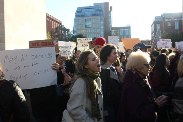 செவ்வாய் கிழமை ஜனாதிபதித் தேர்தலில் டொனால்ட் ட்ரம்ப்பின் வெற்றியை அடுத்து தொடர்ந்து வரும் ஒரு எதிர்ப்பு அலையாக, வெள்ளிக்கிழமை அன்று பெரு நகரங்களிலும் பல்கலைக்கழக வளாகங்களிலும் பத்தாயிரக்ணக்கான ஆர்ப்பாட்டக்காரர்கள் அணிநடையிட்டனர். ஆர்ப்பாட்டக்காரர்கள் மியாமிக்கும் அயோவா நகருக்கும் இடையிலான மாநிலங்களுக்கிடையிலான நெடுஞ்சாலையை மூடிவிட்டனர். ஒமாகா, நெப்ரஸ்கா மற்றும் மின்னியபொலிஸ் மின்னசோட்டாவில் உயர்நிலைப் பள்ளி மாணவர்கள் வெளிநடப்புச்செய்தனர். நியோர்க் மாநகர், போஸ்டன் மற்றும் எங்கும் ”அன்பு பேரணிகள்” கூட்டங்களை ஈர்த்தன.