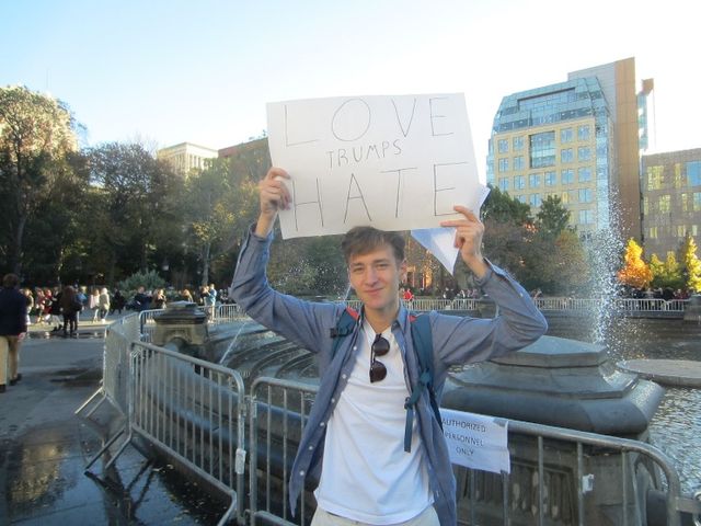 நியூஜெர்சியிலுள்ள Watchung Hills உயர்நிலைப்பள்ளியிலிருந்து வந்த 16 வயது நிரம்பிய மாணவர் Renzo Mayhall பின்வருமாறு குறிப்பிட்டார், “இந்த தேர்தலின் முடிவுகளை எதிர்கொள்கையில் தப்பெண்ணம், இனவாதம் மற்றும் எந்தவகை வெறுப்பிற்கும் தங்களின் எதிர்ப்பைக் காட்டுவதற்கு சாத்தியமான அளவு பல அமெரிக்கர்கள் வெளியே வரவேண்டும் என்பதால் நான் இங்கிருக்கிறேன். பெண்கள், முஸ்லிம்கள் மற்றும் ஹிஸ்பானியர்களுக்கு ட்ரம்ப் ஒரு ஆபத்து என்பது போல அது. சில வெள்ளை மனிதர்களை தவிர ஒருவருக்கும் பாதுகாப்பில்லை.”
