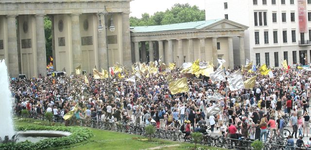 AfD-எதிர்ப்பு ஆர்ப்பாட்டக்காரர்கள் பிரன்டென்பேர்க் வாயில் முன்னால் ஒன்றுகூடினர்