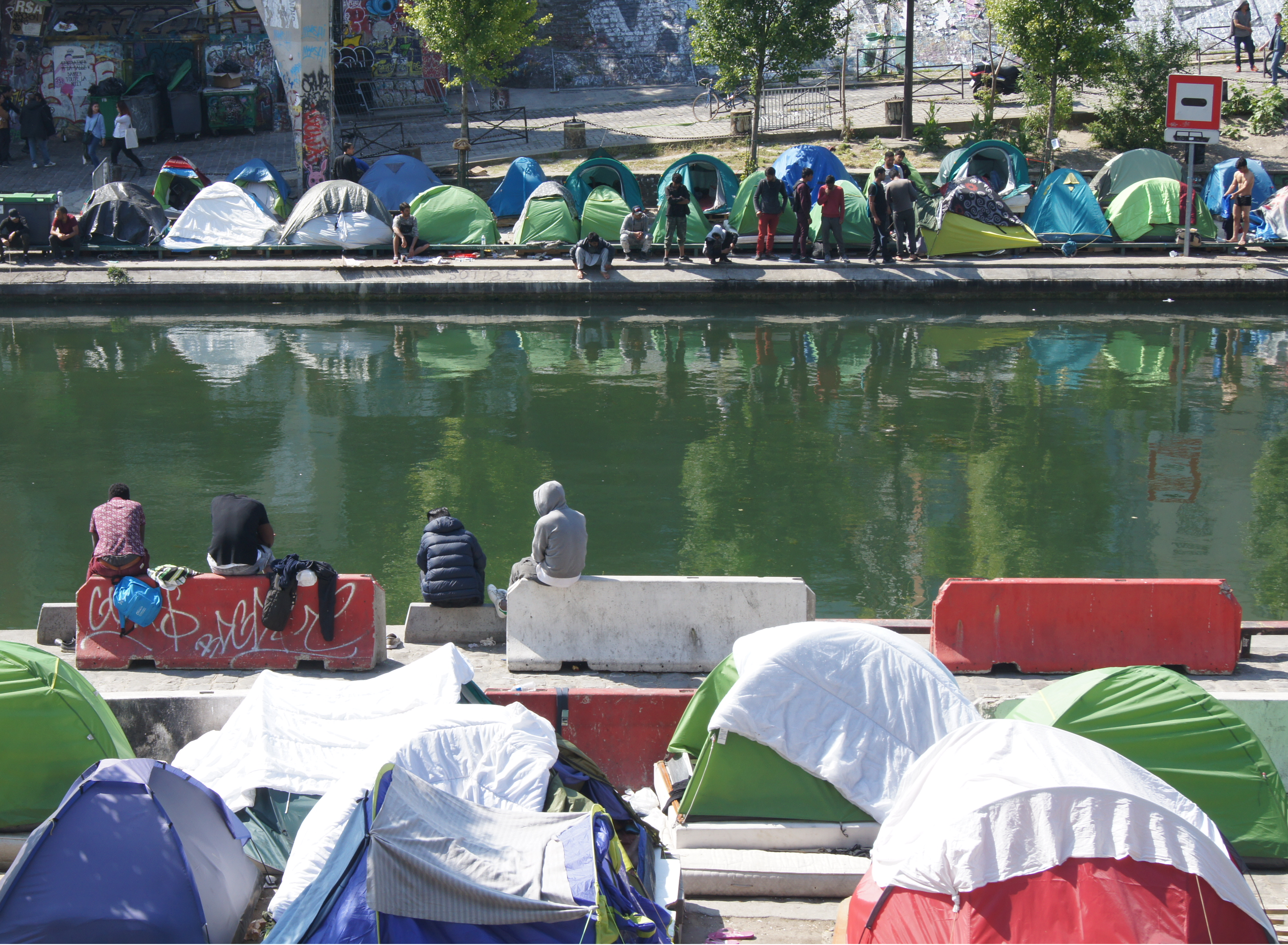 பாரிஸ் 10ல் உள்ள செயின் மார்த்தன் கால்வாய் ஓரத்தில் ஒருபகுதி அகதிகள் படுத்துறங்கும் கூடாரங்கள்