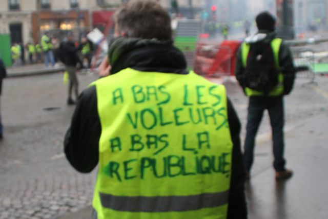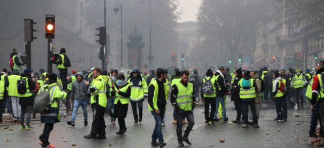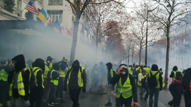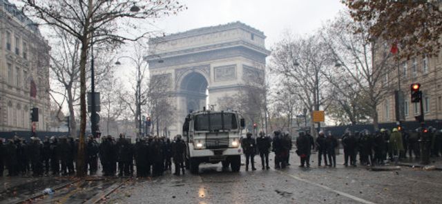 “மக்ரோன் இராஜினாமா செய்" என்ற போராட்டக்காரர்களின் கோஷம், பொலிஸால் அவர்கள் தாக்கப்பட்ட சாம்ப்ஸ்-எலிசே வீதிக்கு பக்கவாட்டு வீதிகள் வரையில் பரவின. அவர்கள் தடையரண்களைக் கட்ட முயன்றபோது, கலகம் ஒடுக்கும் பொலிஸ் சரமாரியாக கண்ணீர் புகைகுண்டுகளை வீசியும், அத்துடன் ஸ்தம்பிக்க செய்யும் கையெறி குண்டுகள், ரப்பர் தோட்டங்கள் மற்றும் நீர் பீய்ச்சிகளைக் கொண்டு தாக்கியும் விடையிறுத்தது.