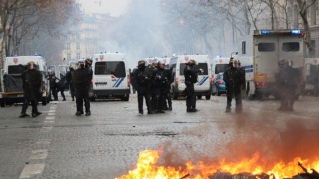 விரைவில் மோதல்கள் அந்நகரம் எங்கிலும் வெடித்தன. கார்களும், ஒரு LCL வங்கி கிளை, பங்குச் சந்தை மற்றும் Jeu de Paume அருங்காட்சியகம் ஆகியவை எரிக்கப்பட்டதுடன், Tuileries பூங்காவின் உலோக கதவுகள் நாசமாக்கப்பட்டன. சமூக ஊடகங்களில் போராட்டக்காரர்கள் வெளியிட்ட காணொளிகள், சிலர் வன்முறை நடவடிக்கைகளில் ஈடுபடுவதைக் காட்டின. இவர்கள் பெரும்பாலும் அனேகமாக சீருடை அணியாத பொலிஸ்காரர்களே ஆத்திரமூட்டுபவர்களாக செயல்பட்டிருக்கலாம். அவர்கள் மஞ்சள் சீருடை அணிந்திருந்தனர் என்பதோடு, ஆடம்பர கார்கள் அல்லது கடைகளைத் தாக்கினர், பின்னர் பொலிஸ் உடன் மென்மையாக சமாதானமாக பேசியவாறு விலகிச் சென்றனர்.