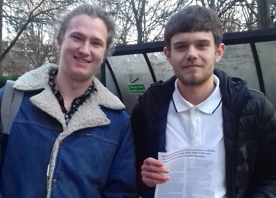 மான்செஸ்டர் பெருநகர பல்கலைக்கழகத்திற்கு வெளியே, மாணவர்களும் பல்கலைக்கழக தொழிலாளர்களும் பிரெஞ்சு போராட்டக்காரர்களுக்கு அவர்களின் நல்லிணக்கத்தை வெளிப்படுத்தினர்.