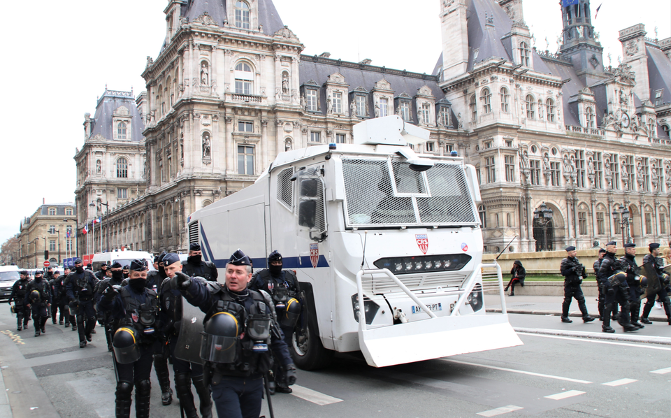 பாரீஸ் நகர மன்றத்தின் முன்னால் நிறுத்தப்பட்டிருக்கும் பொலிஸ் நீர்ப்பீய்ச்சி பீரங்கி
