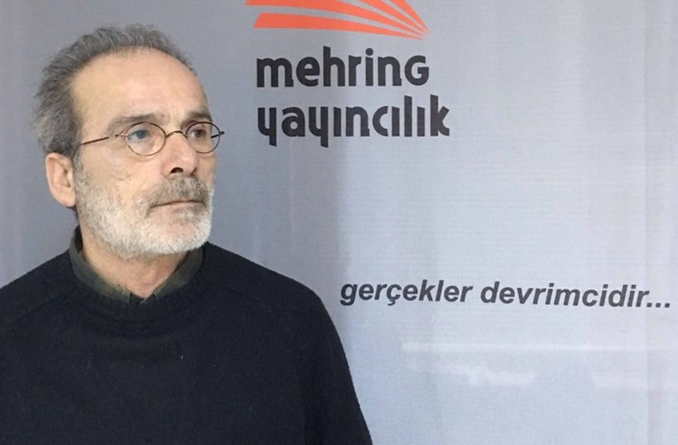 துருக்கிய மெஹ்ரிங் பதிப்பகத்தின் சின்னத்தின் முன் ஹலீல் செலிக்