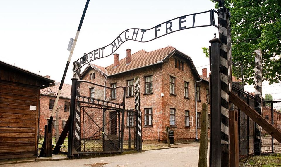 அவுஷ்விட்ஸ் முகாமின் வாயில்" வேலை உங்களை விடுதலை செய்கின்றது என்ற வாசகத்துடன்"