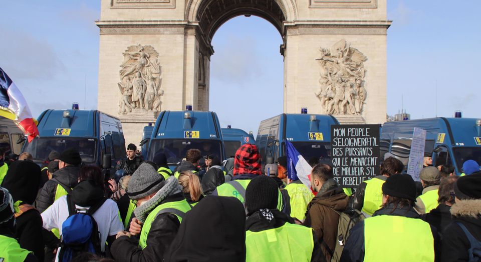 சாம்ப்ஸ்-எலிசே அவென்யூவில் பொலிஸை எதிர்த்து நிற்கும் மஞ்சள் சீருடை ஆர்ப்பாட்டக்காரர்கள்