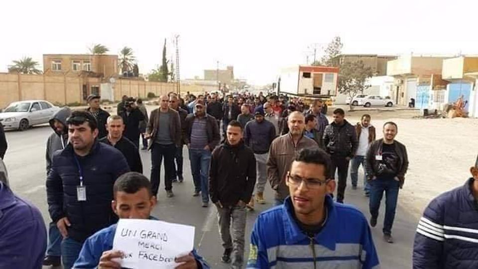 நேற்று, அதே பிராந்தியத்தில் இன்னொரு சோனட்ராக் துணை நிறுவனமான ENGAGEOவின் தொழிலாளர்களும் அவர்களுடன் இணைந்து கொண்டனர். ENGAGEO தொழிலாளர்கள் வேலைகளை புறக்கணித்து அணிவகுத்து செல்லும் ஒரு புகைப்படத்தில் ஒரு வேலைநிறுத்தக்காரரின் சுலோகம், "முகநூலிற்கு மிகப்பெரும் நன்றி! என தெரிவிக்கிறது." மத்திய அல்ஜீரியாவின் அட்ராரில் உள்ள Oued Ezzine எரிவாயு தொகுதியின் நூற்றுக்கணக்கான தொழிலாளர்களும் திங்களன்று வேலைநிறுத்தத்தில் இணைந்தனர். குல்மாவில் உள்ள சோனேல்காஸ் தொழிலாளர்கள் தங்கள் அலுவலகங்களுக்கு வெளியே அமர்ந்து போராட்டத்தில் ஈடுபட்டனர்.