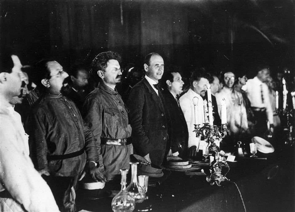 கம்யூனிஸ்ட் அகிலத்தின் இரண்டாவது மாநாடு (இடதில் இருந்து மூன்றாவதாக, பௌல் லெவி மற்றும் சினோவியேவ் ஐ அடுத்து ட்ரொட்ஸ்கி)
