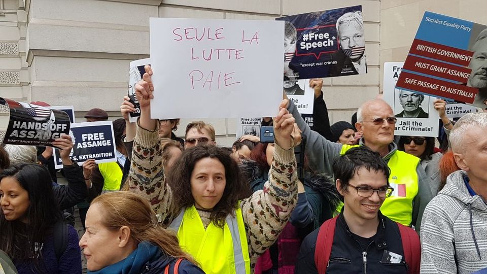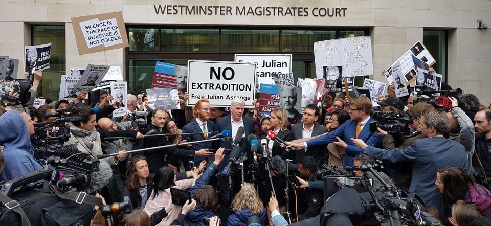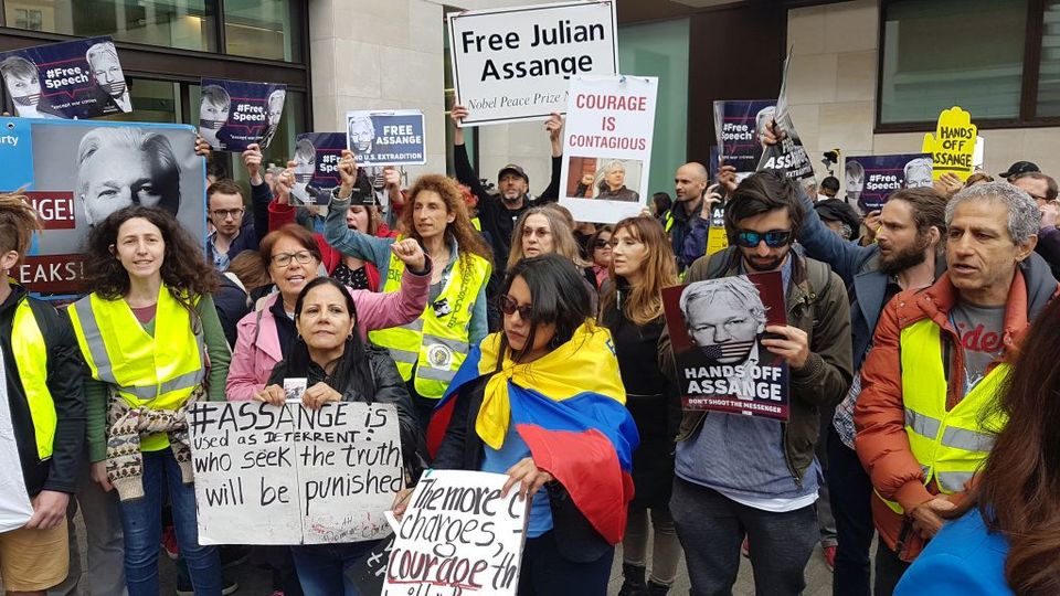 நீதிமன்றத்திற்கு வெளியே அசான்ஜை ஆதரிக்கும் எதிர்ப்பாளர்களின் ஒரு பகுதி