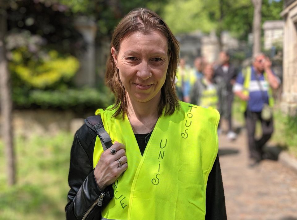 மஞ்சள் சீருடை எதிர்ப்பாளர்கள் கம்யூனார்ட்டுக்களின் சுவரை நோக்கி கல்லறை வழியாக அணிவகுத்து செல்கின்றனர்