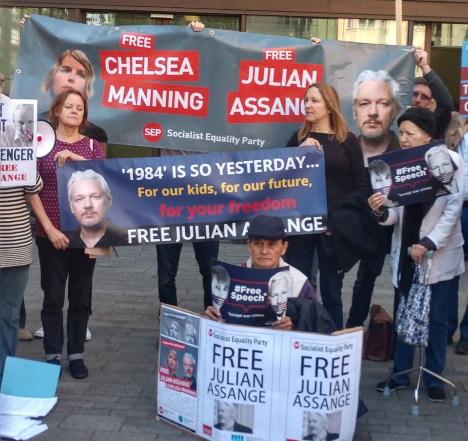 வீட்டில் தயாரிக்கப்பட்ட சுலோக அட்டைகள், “அசான்ஜை விடுதலை செய், போர் குற்றவாளிகளை சிறையிலிடு,” “ஜூலியன் அசான்ஜை விடுதலை செய், அவர் அமைதிக்கான நோபல் பரிசுக்கு பரிந்துரைக்கப்பட்டவர்” மேலும் “பத்திரிகைக்கு சுதந்திரமளி, அசான்ஜிற்கு சுதந்திரமளி” போன்ற கோஷங்களை கொண்டிருந்தன. SEP இன் பதாகைகளும் சுலோக அட்டைகளும், அசான்ஜ் மற்றும் சிறையிலிடப்பட்டுள்ள இரகசிய செய்தி வெளியீட்டாளர் செல்சி மானிங்கையும் விடுதலை செய்யக் கோரின.
