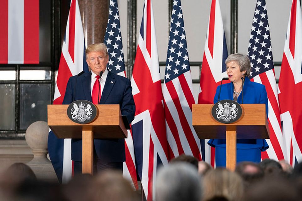 இலண்டனில் 10 டவுனிங் தெருவில், ஜூன் 4, 2019 அன்று பிரிட்டிஷ் பிரதம மந்திரி தெரெசா மே உடன் ஒரு கூட்டு பத்திரிகையாளர் மாநாட்டில் ஜனாதிபதி டொனால்ட் ஜே. டிரம்ப் பங்கேற்கிறார். (உத்தியோகபூர்வ வெள்ளை மாளிகையின் புகைப்படம் ஷீலா கிரெய்க்ஹே மூலம்)