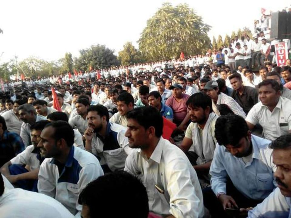 மாருதி சுசூகி தொழிலாளர்கள் தங்கள் சகாக்களை விடுதலை செய்யக் கோரி ஆர்ப்பாட்டம் செய்கின்றனர்