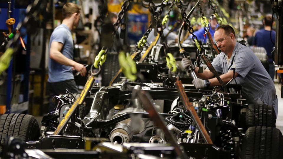 கிளேகொமோவின் கன்சாஸ் நகர ஃபோர்ட் உற்பத்தி ஆலையில் ஒரு புதிய அலுமனிய-அலாய் கட்டமைப்பில் ஃபோர்ட் எஃப்-150 பாரவூர்தி மீது என்ஜினைப் பொருத்துவதற்காக வாகனத்துறை தொழிலாளளி ஒருவர் மேல்கட்டமைப்பைத் தயாரித்துக் கொண்டிருக்கிறார் (படம்: அசோசியேடெட் பிரஸ்/சார்லி ரீடெல்)